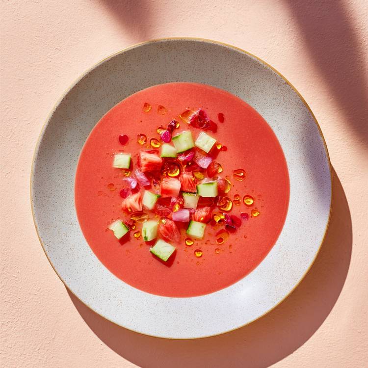 À Paris, certains mariages surprennent… puis deviennent évidents. Dans ce gaspacho doux, la tomate mûre et la fraise juteuse jouent les duos de saison. Un primeur dirait : « quand les fruits sont parfaits, il suffit de les écouter ». Résultat : une soupe froide fraîche, vive et très estivale.