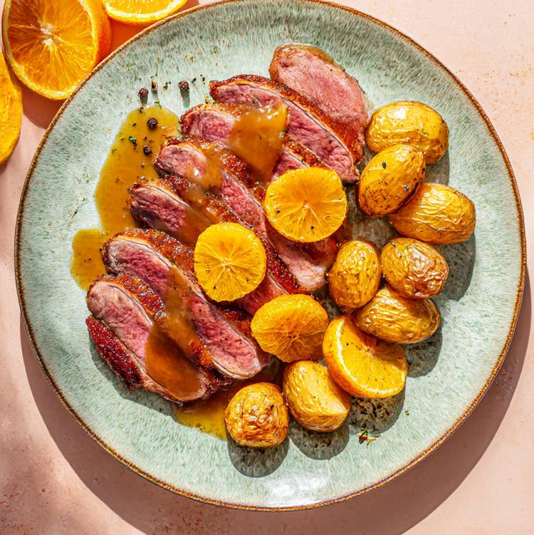 Servez le magret tranché, nappé de sauce à l’orange, accompagné des pommes de terre grenaille dorées.