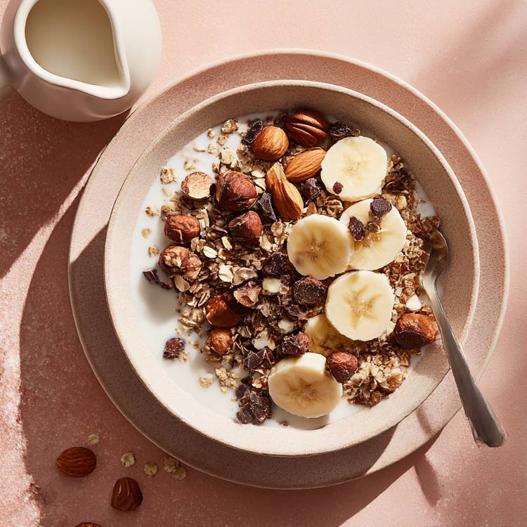 Finaliser au moment du service : Coupez la banane en rondelles, versez le lait d’avoine bien frais et servez immédiatement.