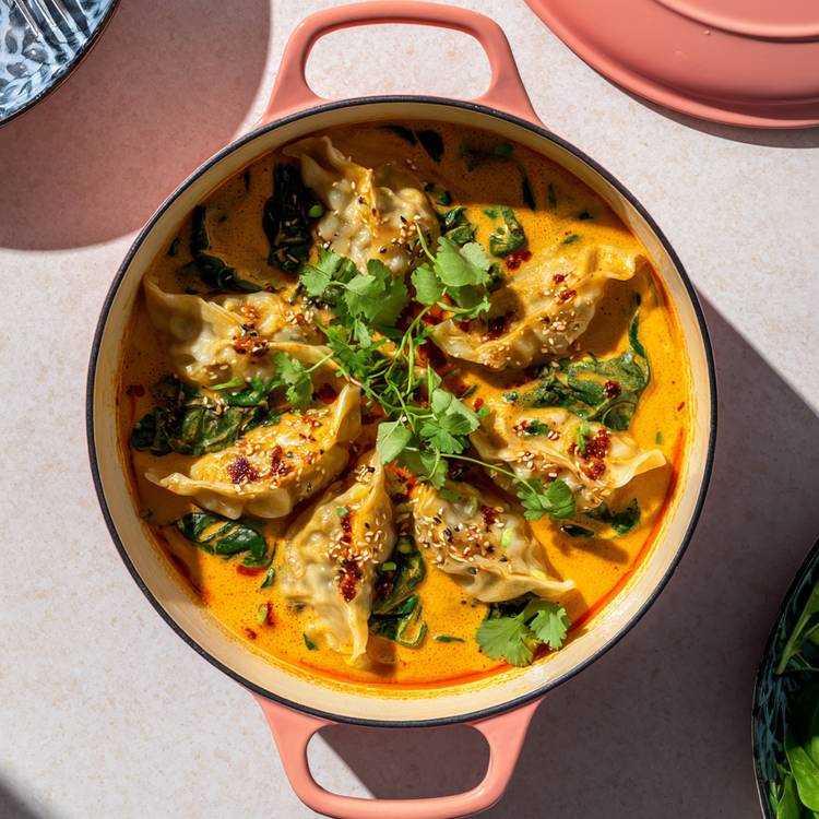 Des gyoza au poulet frais qui mijotent doucement en cocotte dans un bouillon coco-curry parfumé. Un seul plat, zéro stress, et ce twist asiatique qui réveille la routine sans exploser la vaisselle.