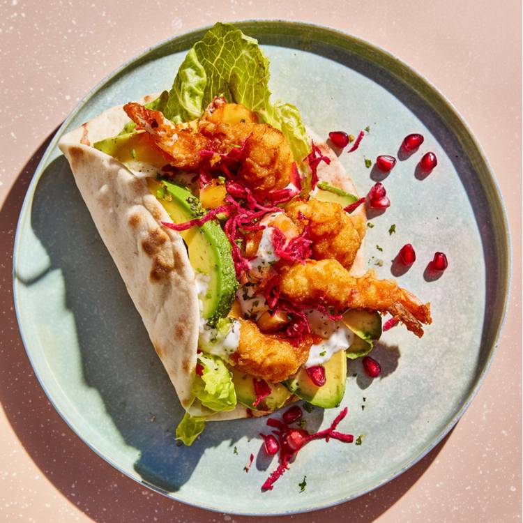 Quand les crevettes tempura déjà prêtes rencontrent un pita bien garni, le déjeuner devient franchement stylé. Mangue fruitée, Avocat crémeux, Grenade croquante.