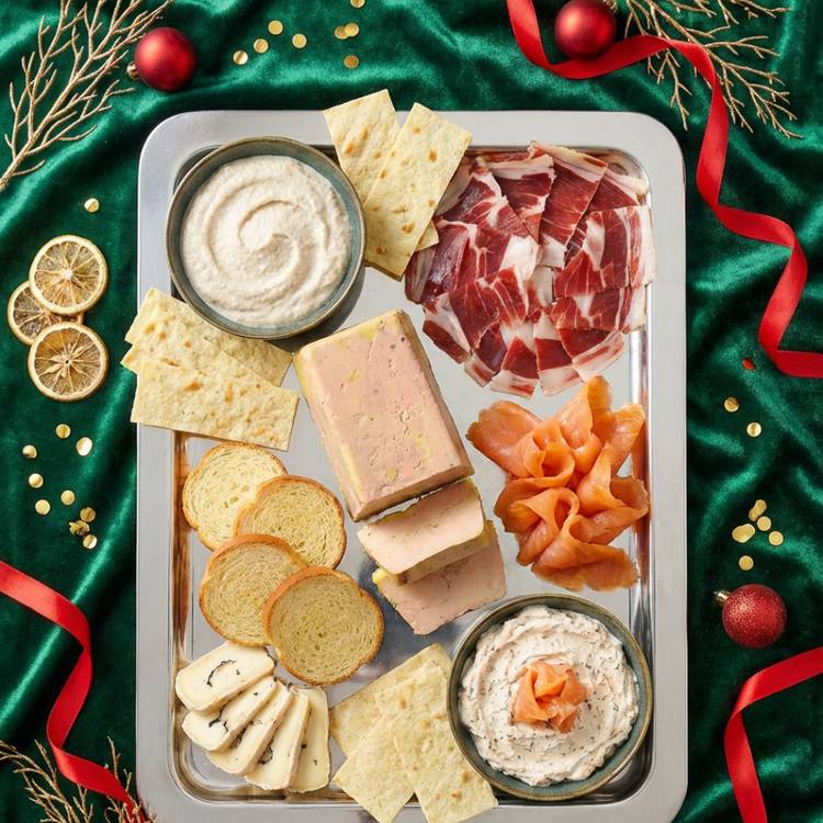 Ici, pas de cuisson, juste du tranchage, du dressage et beaucoup de plaisir. Ce plateau réunit le meilleur du terroir et de l’apéro chic : entre les notes fumées du magret, la noblesse d’un Bellota affiné 48 mois et la gourmandise iodée du cœur de saumon, chaque bouchée est une invitation à sabrer les bulles. Ajoutez à cela une touche de citron, un pain brioché tout doux et le croustillant du Guttiau au romarin… et vous avez là la recette d’une soirée réussie.
