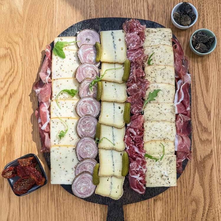 Amateurs de fondues bien balancées ? Cette raclette insolite est faite pour vous. Une planche pas comme les autres, où la moutarde se fond dans le fromage, où les œufs de caille apportent une touche chic, et où les morilles font de l’ombre aux classiques cornichons. Côté charcuterie, on monte d’un cran avec de la rosette de Lyon, de l’andouille de Guémené et du speck légèrement fumé. Côté fromages, on jongle entre chèvre, bleu (si dispo), Morbier et raclette affinée. Et toujours les pommes de terre bien chaudes pour accueillir ces folies fondantes.