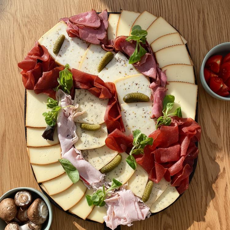 Dressez tout sur une grande planche : pommes de terre fumantes, légumes frais et charcuterie. Chacun fait fondre son fromage et compose sa bouchée parfaite.