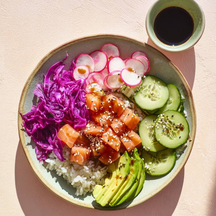 Répartissez le riz dans les bols, ajoutez le saumon mariné et disposez harmonieusement le chou rouge, les radis, l’avocat, le concombre et quelques feuilles de nori pour une touche iodée et originale. Parsemez de graine de sésame.