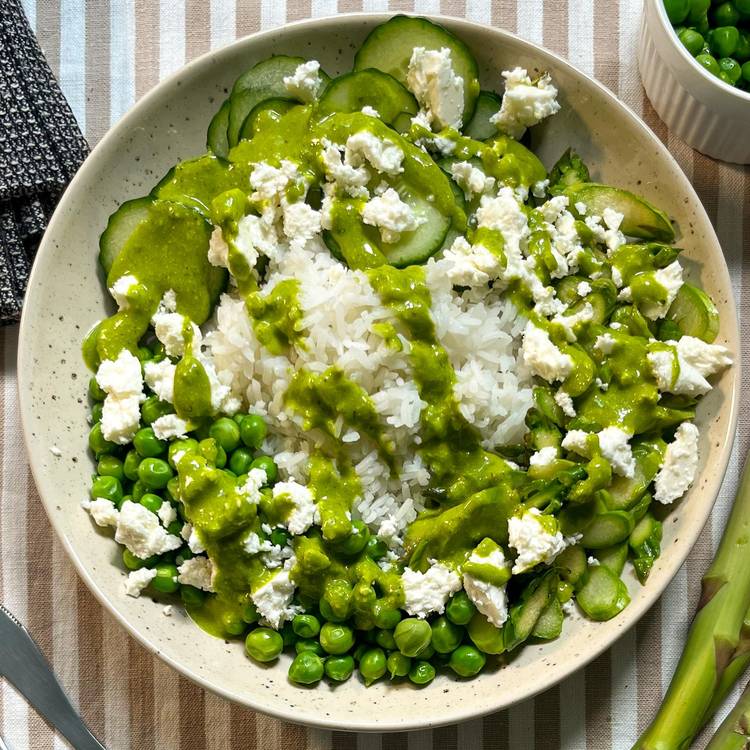 Préparez votre pesto maison en mixant les pistaches, le basilic, l’ail des ours, l’huile d’olive, le parmesan et une pincée de poivre. Dans un bol, réalisez la vinaigrette au pesto en fouettant votre pesto, la moutarde et le jus de citron. Dressez les bols avec le riz, les asperges, le concombre et les petits pois. Nappez généreusement de vinaigrette au pesto, puis terminez par de la feta émiettée pour la touche salée et crémeuse.