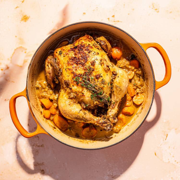 Préparez la garniture aromatique : Épluchez puis émincez les oignons, coupez les carottes en rondelles et écrasez les gousses d’ail. Ajoutez-les autour du poulet et laissez cuire 5 minutes.