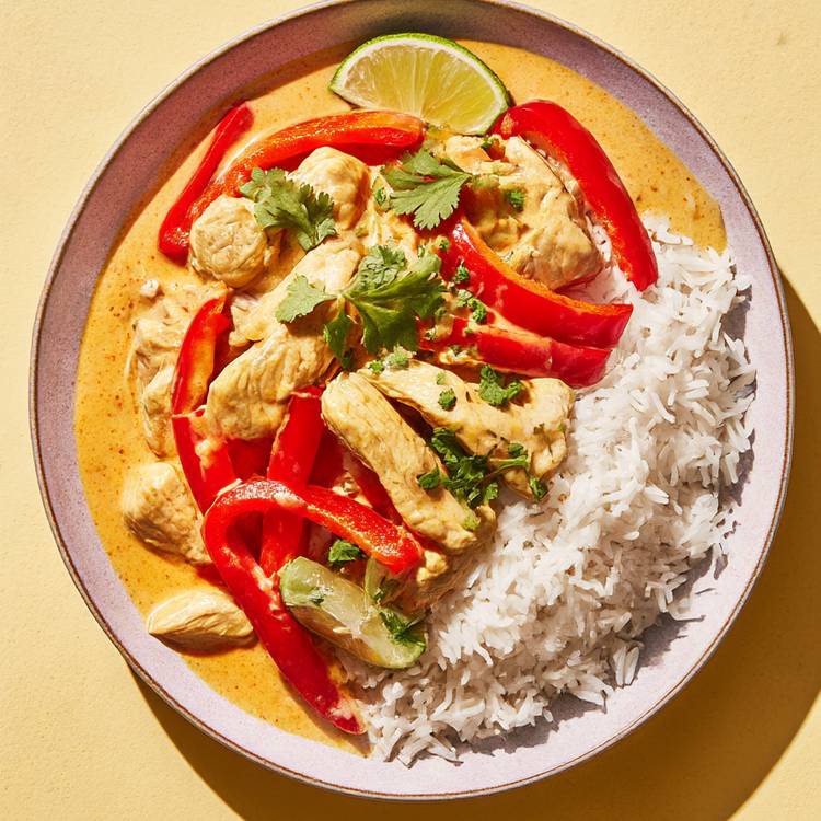 Pendant ce temps, faites cuire le riz dans une casserole d’eau bouillante salée pendant 12 min. Égouttez-le soigneusement. Servez le curry bien chaud sur un lit de riz, parsemé de Coriandre fraîche ciselée et d’un filet de jus de Citron vert.
