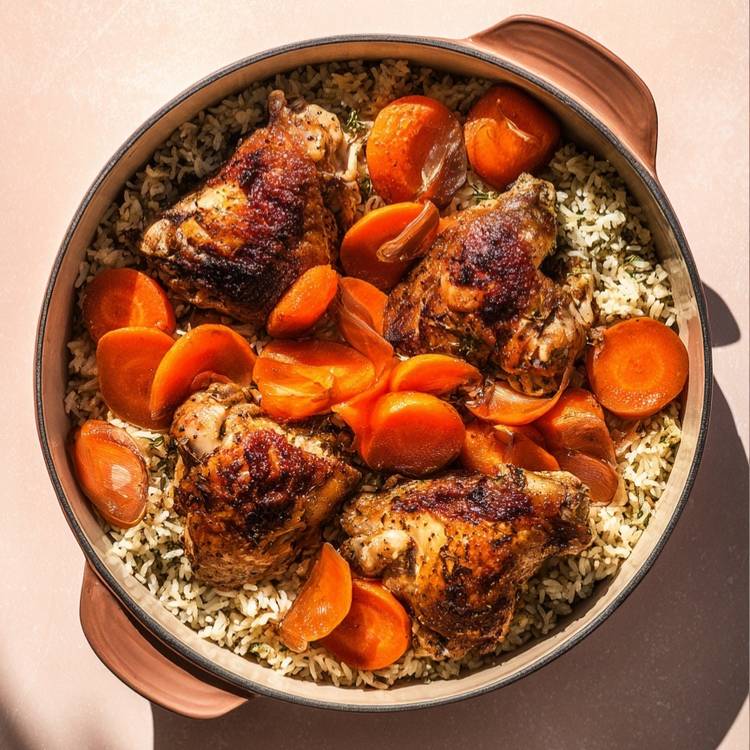 Riz pilaf, poulet juteux, carottes fondantes : le trio qui bosse pendant que vous levez le pied. Une cuisson douce, un minimum de gestes, un max de goût. Astuce de chef : tout cuire dans le même jus, c’est là que la magie opère.