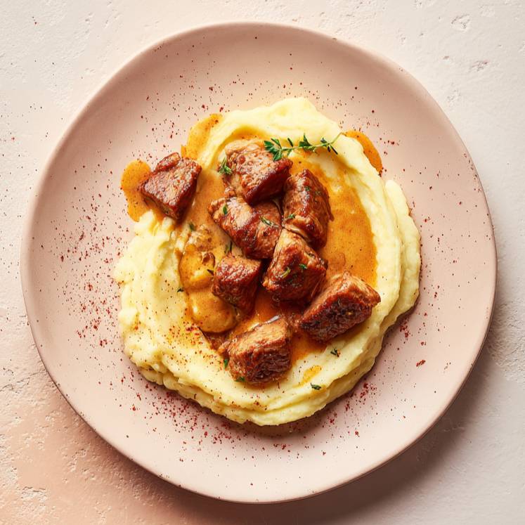 Servez le sauté nappé de sa sauce crémeuse au paprika, accompagné d’une généreuse portion de purée maison, de carottes rôties et d’une salade croquante !