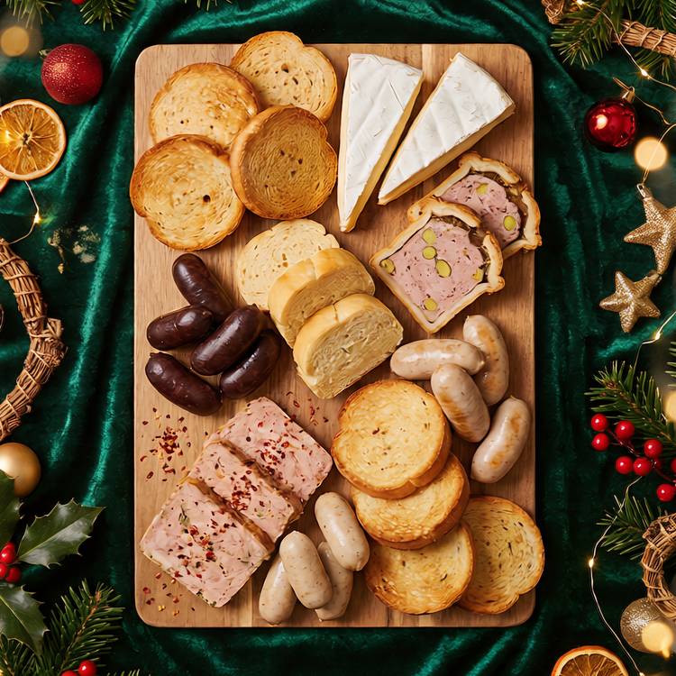 Pendant que le sapin brille et que les flûtes tintent, mettez le terroir à l’honneur avec un plateau apéritif pensé pour les fêtes. On y retrouve le croustillant d’un pâté en croûte pistaché, l’onctuosité d’un brie affiné, des mini boudins festifs aux morilles ou façon antillaise, le tout accompagné de pain toasté et de cornichons acidulés. C’est la promesse d’un apéritif joyeux, généreux, où chaque bouchée invite à trinquer.