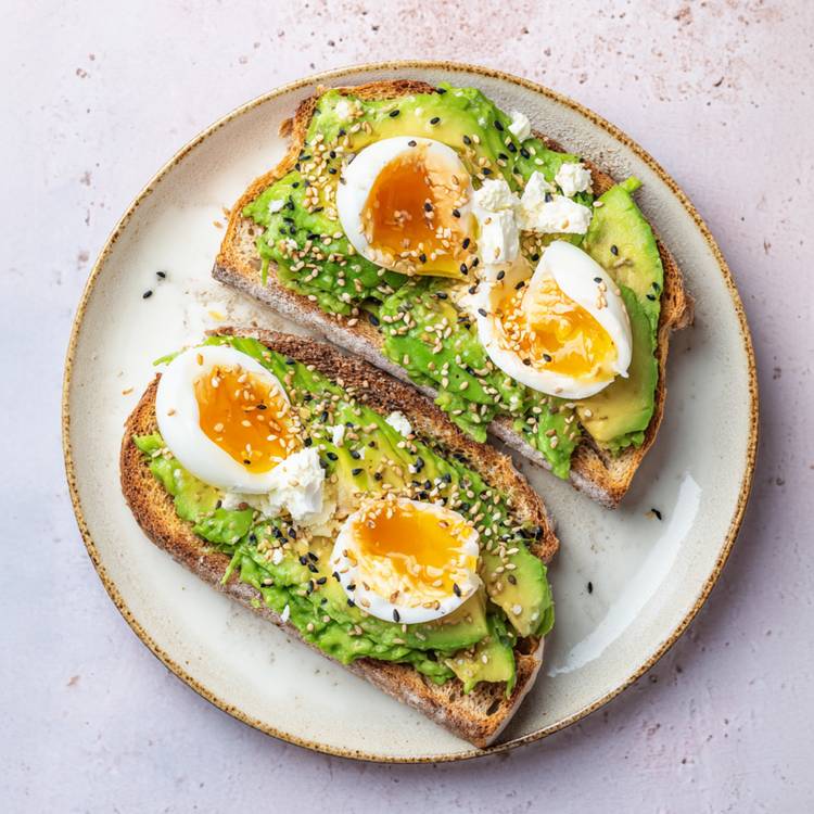 Pain de campagne croustillant, avocat fondant, œufs mollets au cœur coulant et fromage cottage frais. Un toast généreux qui apporte des protéines et des lipides de qualité, dans une assiette simple et maîtrisée.