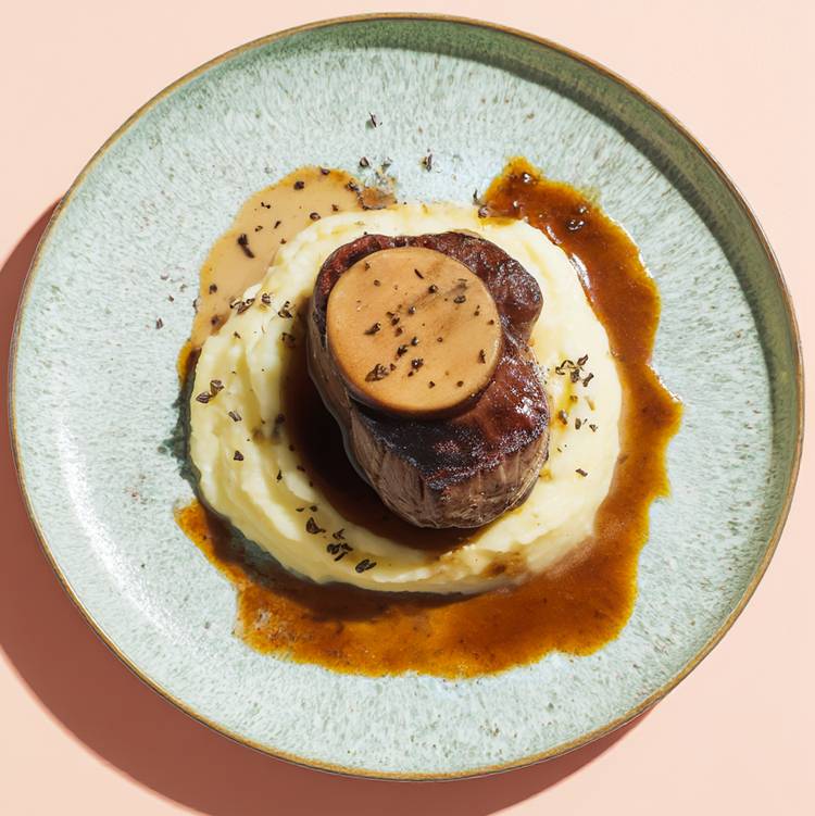 Montez le plat : déposez un Tournedos sur chaque assiette, ajoutez une tranche de Foie gras par-dessus. Servez avec une belle quenelle de purée à la truffe, nappée d’un peu de jus de cuisson.