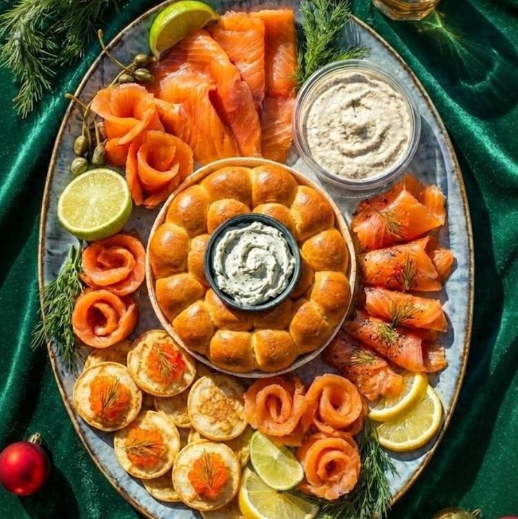 Oubliez les cacahuètes et les chips de dernière minute. Ce plateau de Noël 100 % saumon est une ode à l’iode et à la fraîcheur. Entre les tranches fondantes de saumon fumé, le cœur citron-basilic plein de peps, le tarama crémeux et les tartinables à partager, on navigue quelque part entre Oslo et Saint-Germain. Le tout escorté de blinis moelleux, d’une brioche parfumée et d’un beurre à la truffe qu’on déguste du bout des doigts. Un apéritif qui change la donne, sans en faire trop.