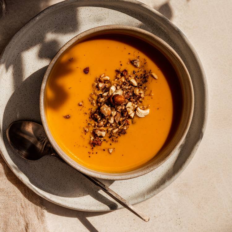 Pendant ce temps, réalisez la dukkah : torréfiez les Noisettes au four, les épices à la poêle. Laissez refroidir. Mixez au mini bol en mode Pulse jusqu’à texture sableuse. Servez le velouté chaud, parsemé de dukkah croquante.
