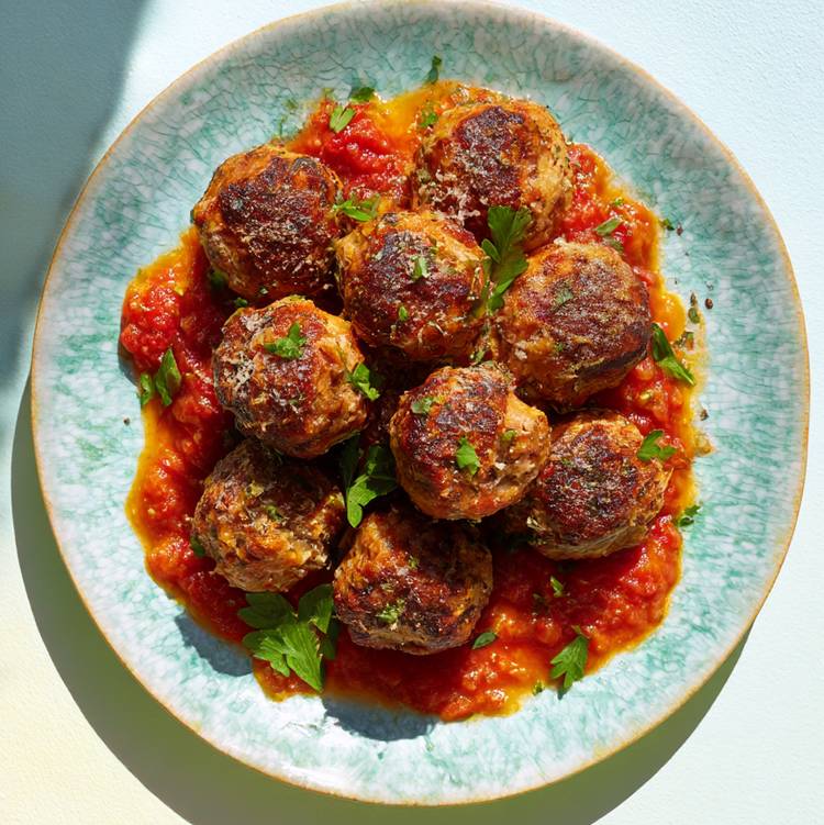 Ajoutez la sauce et enfournez : Versez les tomates concassées directement autour des boulettes. Arrosez le tout d’un filet d’huile d’olive. Faites cuire 20 min à 200°C.
