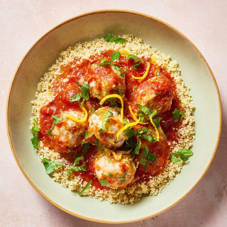 Assembler et servir : Ajoutez les boulettes dans la sauce, laissez cuire encore 6 à 7 min à feu doux, servez sur la semoule chaude et parsemez de persil ciselé.