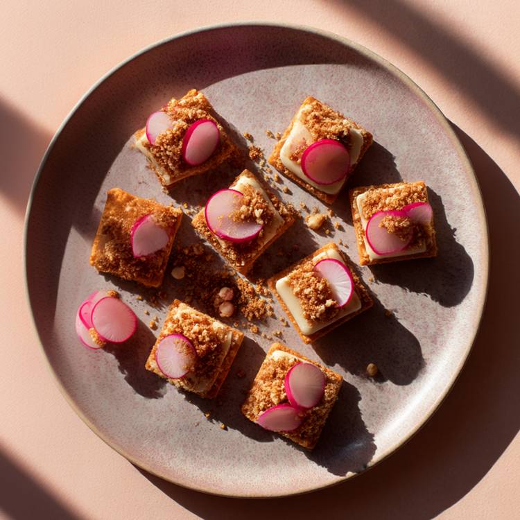 Dressez avec précision : Tartinez les crackers de beurre vinaigre échalote, disposez les radis puis saupoudrez généreusement de chapelure noisette, de sel et de poivre, avant de servir immédiatement. Ajoutez une pincée de piment d'Espelette si cela vous tente !