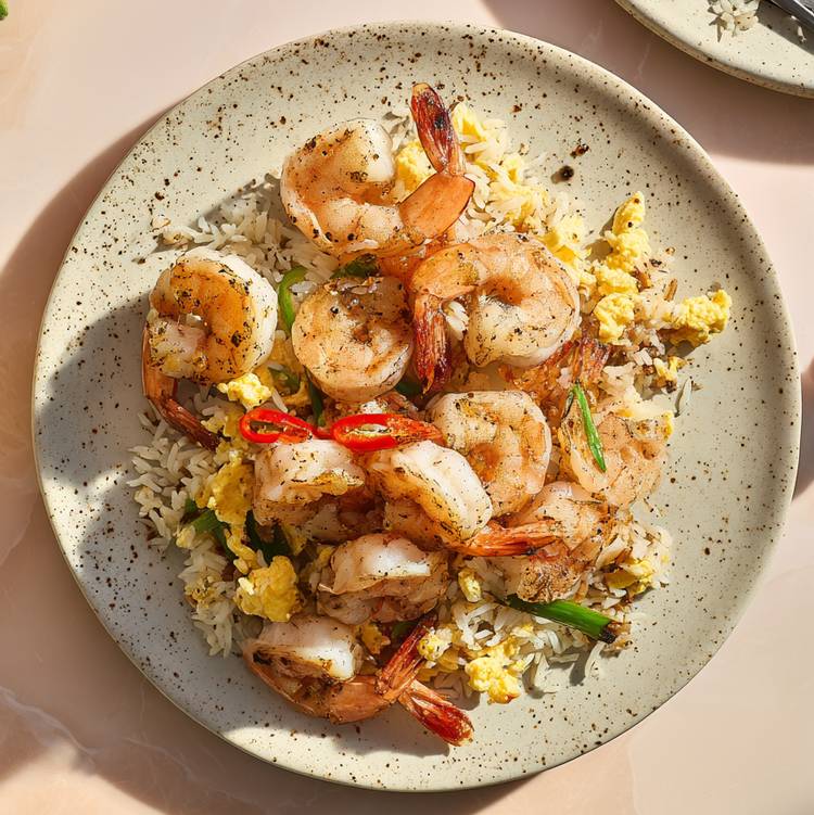 Des crevettes croustillantes, sel et poivre bien dosés, et un riz sauté parfumé qui absorbe les sucs.