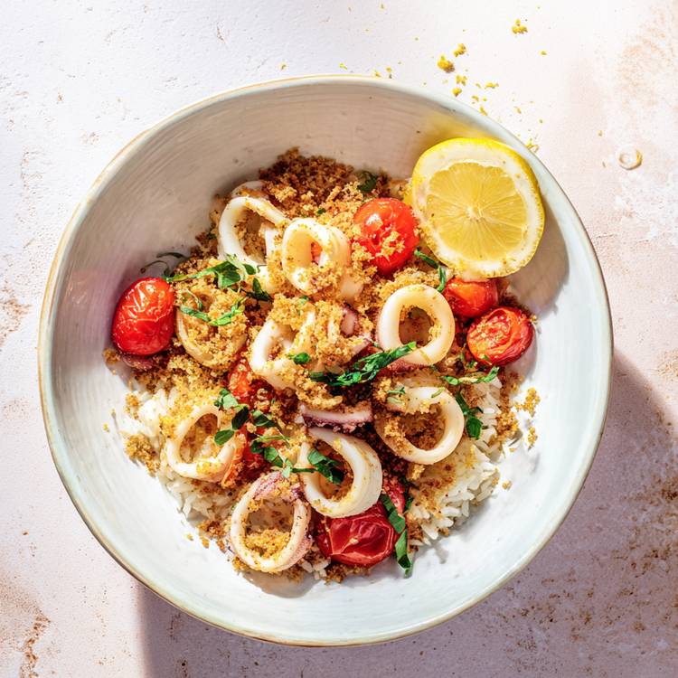 Encornets dorés, tomates cerises juteuses et chapelure croustillante : une combinaison très trattoria. L’huile d’olive et le citron réveillent le tout pour un plat simple et parfumé. Servi sur un bol de riz, c’est la dolce vita version dîner rapide.