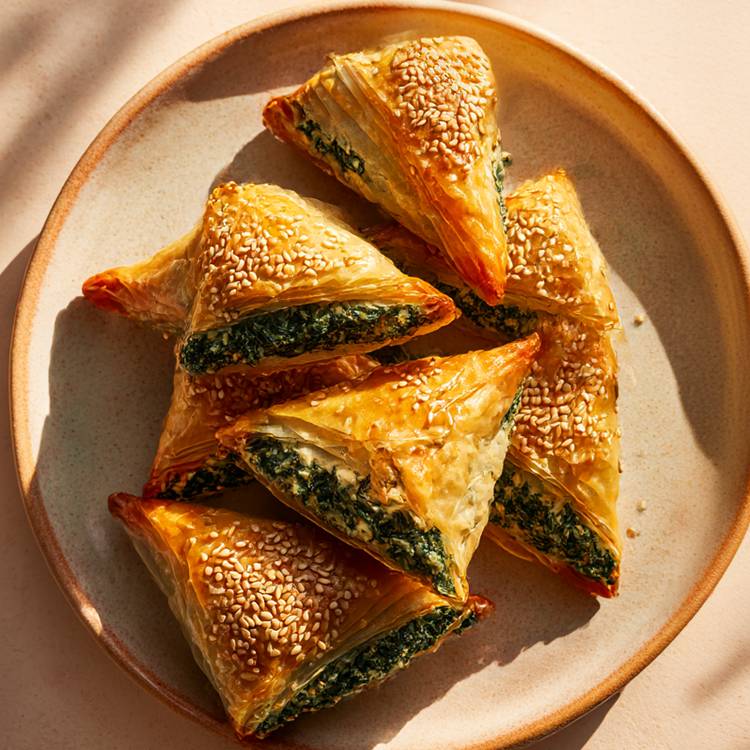 Aussi appelés spanakópita, ces feuilletés mêlent épinards fondants et feta salée dans une feuille de brick dorée.