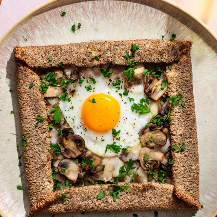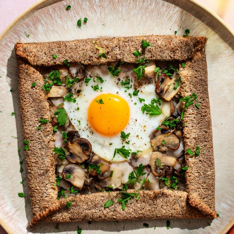 Ici, on part sur une base solide : galette de sarrasin, œuf, jambon, fromage. Mais on y glisse une poêlée de champignons bien dorés à l’ail, pour twister ce grand classique sans le trahir. Résultat : un plat complet, réconfortant et savoureux, à déguster au déjeuner ou en dîner sans prise de tête.