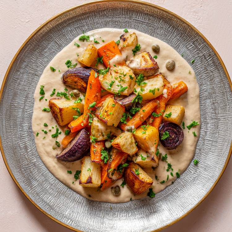 Des légumes anciens rôtis au four, enrobés d’une marinade chaude au miel et curcuma. Une sauce onctueuse au tahini et fromage blanc les accueille au fond de l’assiette, pendant que les câpres et un filet de miel viennent twister l’ensemble juste avant le service. Une recette veggie, fondante, parfumée, et visuellement soignée.