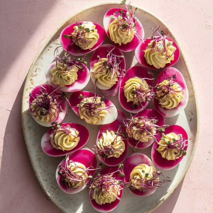 La betterave colore délicatement les blancs d’œufs tandis que la garniture reste crémeuse. Quelques graines germées de betterave viennent finir l’assiette : frais, festif, irrésistiblement printanier.