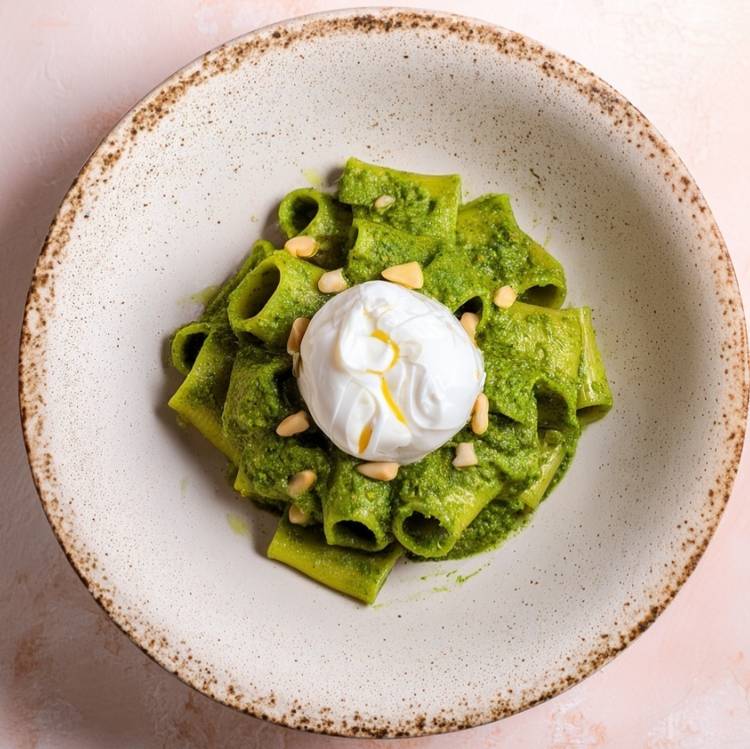 Quand l’ail des ours arrive sur les étals, les Épic’Urbains savent que la saison du pesto sauvage commence. Paccheri al dente, pesto d’ail des ours bien monté à l’huile d’olive et burrata déposée dessus : peu d’ingrédients, mais le goût franc du produit. La dolce vita version marché.