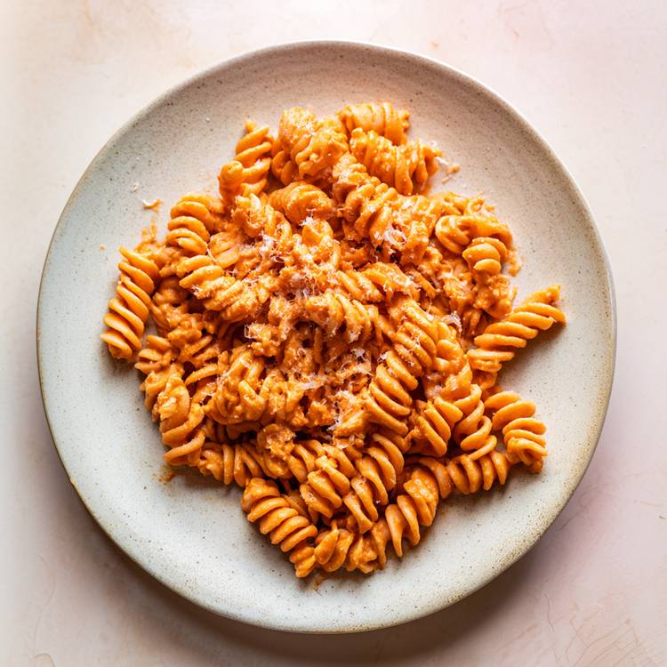 On pense pasta crémeuse, on imagine crème et parmesan. Ici, le twist vient du poivron rôti, mixé en velours soyeux. Il colore l’assiette, booste la saveur, et se fond dans la sauce sans jamais s’imposer.