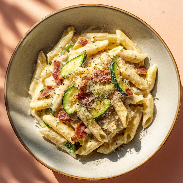Des lardons bien dorés, une courgette fondante, une crème qui enlace les pâtes sans les noyer.