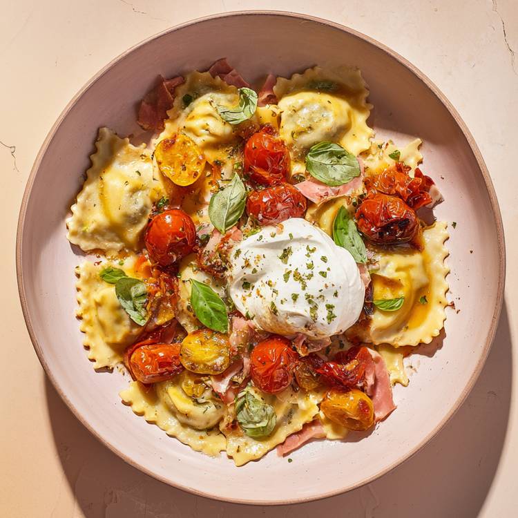 Servez les ravioli dans une assiette creuse: Ajoutez les tomates rôties avec leur jus, le jambon de Parme, parsemez de basilic, et déposez un morceau de burrata sur le dessus. Terminez avec un filet d’huile d’olive et régalez vous !