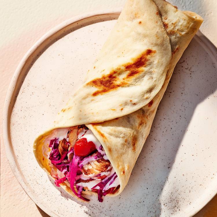 Poulet mariné aux épices, hauts de cuisse bien dorés, salade croquante et sauce tahini citronnée. On roule, on grille, on croque.