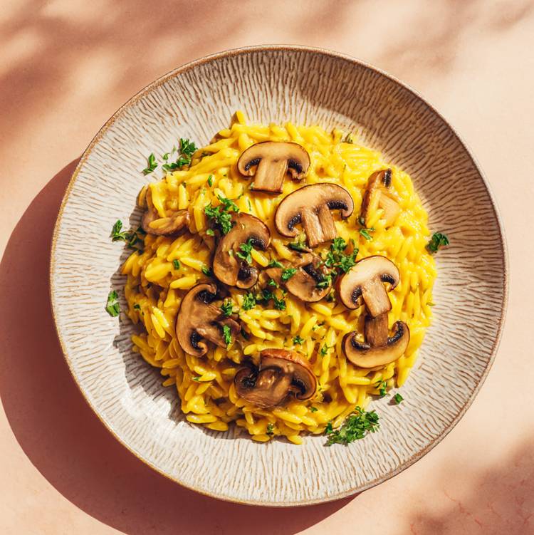 Ici, pas de crème, pas de fioritures, mais une cuisson douce dans un bouillon parfumé. L’Orzo absorbe le Bouillon de légumes, s’imprègne du Curcuma, pendant que les Champignons dorent en toute simplicité. Résultat ? Un plat fondant, coloré, avec une vraie profondeur de goût. On saupoudre un peu de poivre, on file à table.