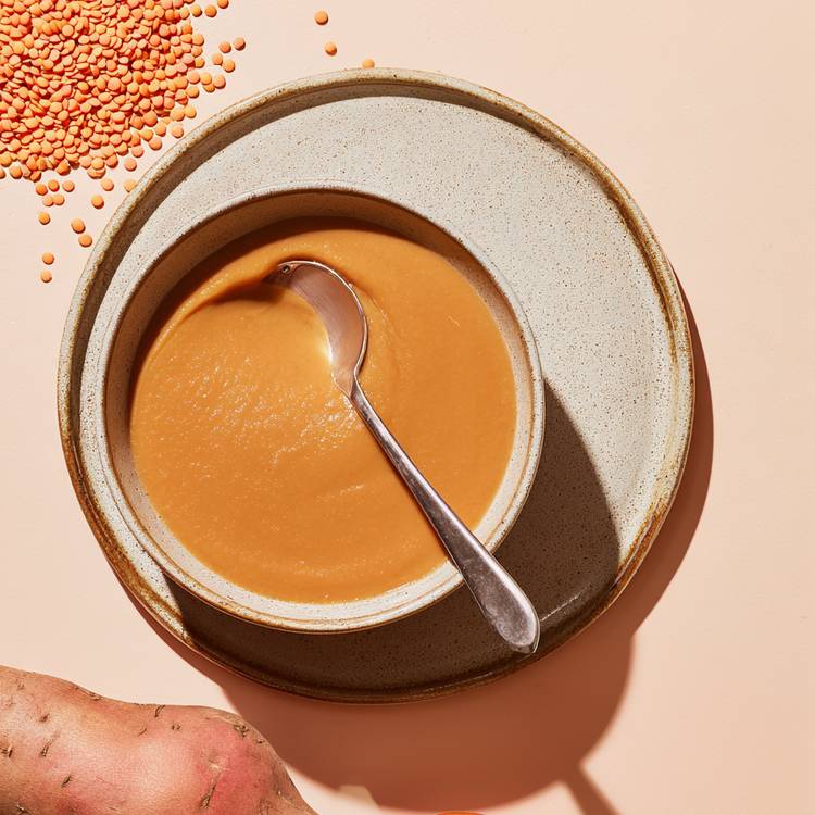 Lentilles corail fondantes, patate douce bien coupée, cuisson douce : un velouté simple, nourrissant, et parfaitement dans l’esprit du marché.